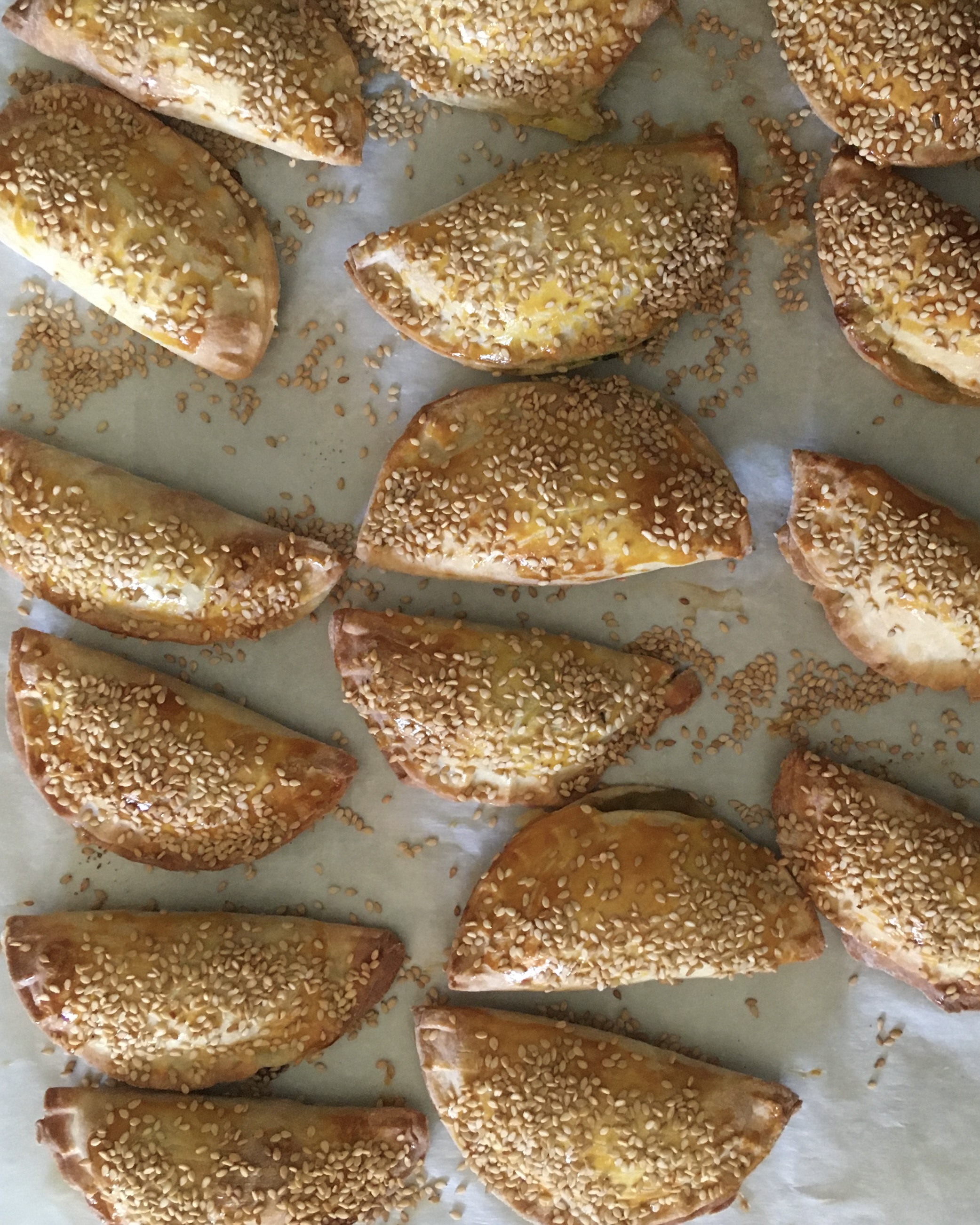 While Ninila filled the kaltsounia, Sabaleon brushed a little olive oil over them and set them on a baking pan. “Now we bake for half an hour,” he said.