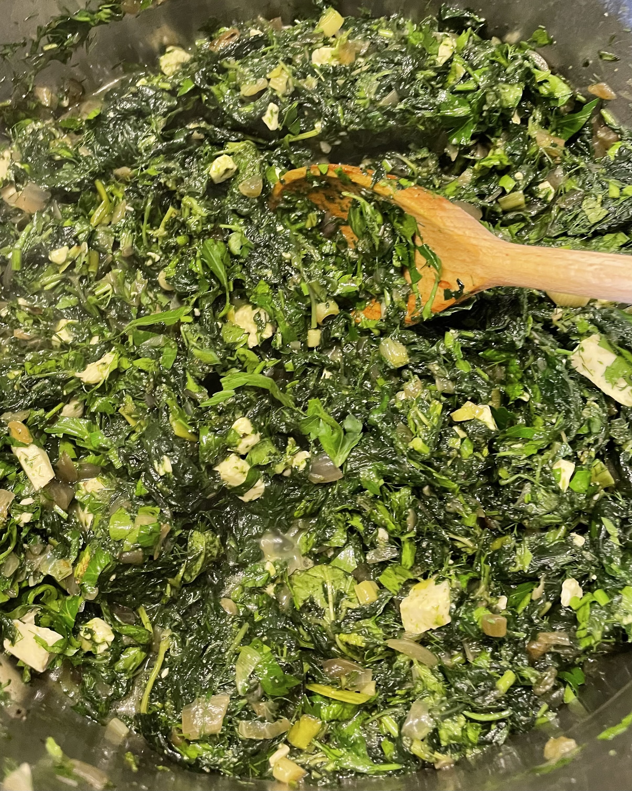 “Two minas of greens—spinach, sorrel, and hartwort. Five scallions. One cup dill. Half a cup parsley. One cup mint leaves. Half a cup olive oil. One-third cup raki. Two small spoons salt. Two small spoons freshly ground long pepper.”